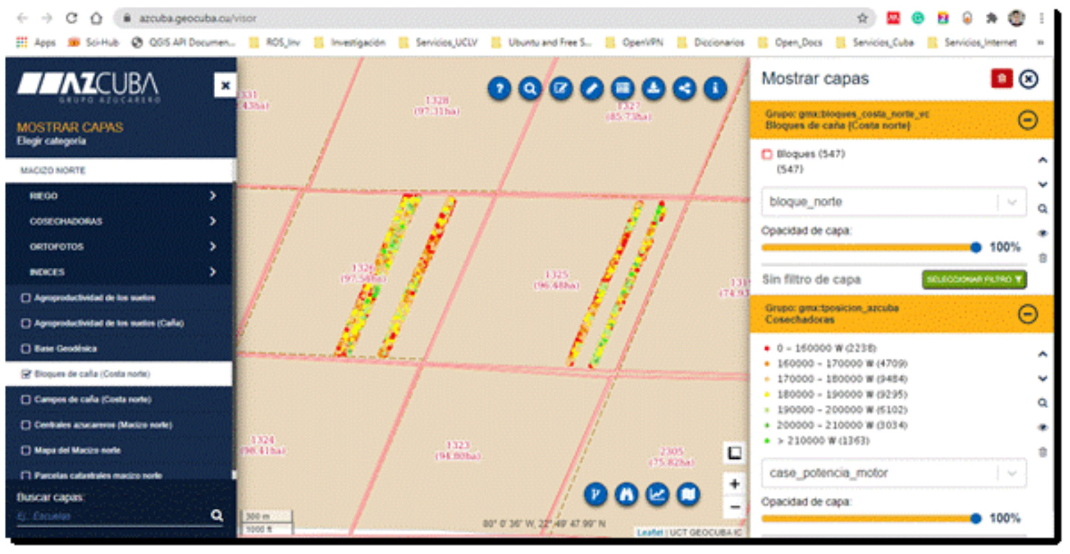 The use of web platforms for the management of spatial data is of great importance for administrative decision-making by users who do not always have high knowledge of geomatics (Hernández, 2021). To this end, the sugar company personnel was trained to process the data exported by the harvester and make them compatible with the necessary standards to incorporate them into AZCUBA IDE, which can be consulted through the link https://azcuba.geocuba.cu/viewer (Figure 7).