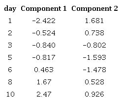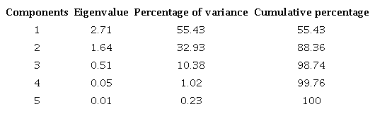 Table 1 shows the selection of two components (eigenvalues above one). Note that the first two components explain 88.36% of the total variability. This indicates that, from 5 initial variables, two components can be extracted to explain the association between the variables and observations.