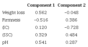 The weight of the variables in component 1 is fundamentally characterized by the variables loss of weight, pH and firmness (Table 2) while component 2 is characterized by the soluble solids content and the color index.