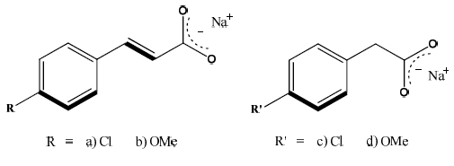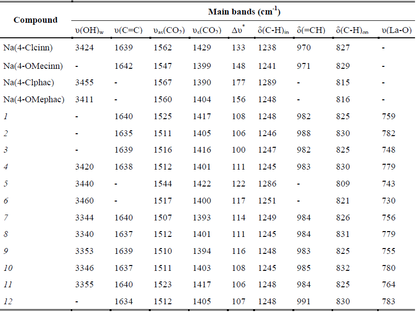 4-chloro-cinnamic acid (4-ClcinnH), 4-methoxy-cinnamic acid (4-OMecinnH), 4-chloro-phenylacetic acid (4-ClphacH), 4-methoxy-phenylacetic acid (4-OMephacH) and LnCl3·xH2O (Ln = Y, Ce, Nd, Sm, Yb) were purchased from Sigma- Aldrich, and other chemicals were obtained comercially and used without further purification. Sodium cinnamates were synthesized by neutralization of its respective acid with a NaOH solution in water. Microanalyses were performed with a Flash EA 1112 Series CHN Analyzer. Metal analyses were performed in duplicate by ethylene-diamine tetraacetic acid (EDTA) titration (direct complex-metric titration)9 and using xylenol orange as indicator. Molar conductance of 10-3 M solutions of the complexes in DMF was recorded on a Thermo Orion 150 conductivity meter by using 0.01 M KCl water solution as calibrant. A Shimadzu UV-1700 spectrophotometer was used to record the electronic spectra. Infrared spectra were recorded with a NICOLET 6700 Spectrometer (4000-400 cm-1 with a recording accuracy of 1 cm-1). Thermogravimetric analyses were performed with a NETZSCH TG 209 F1 thermal analyzer. Heating was conducted under static conditions in nitrogen with a range of 20-700 °C at 20 °C.min-1 in an Al2O3 crucible.