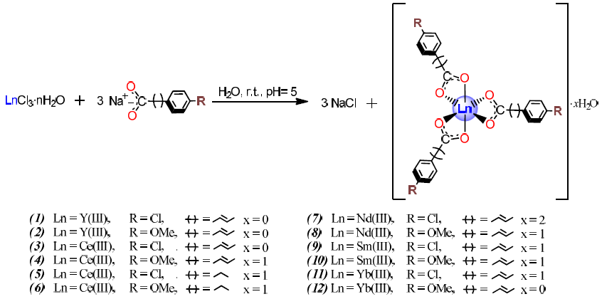 Lanthanide complexes 1-12 have been prepared using methods that involve a metathesis or double displacement reaction, similar to those described in the literature. Complexes 1-12 were isolated as solids in powder, soluble in DMSO, DMF, and acetone, and partially soluble in water and hexane. The results obtained by elemental analysis (carbon and hydrogen), by EDTA complexometry and by TG-DTG analysis, agree with all structures proposed.