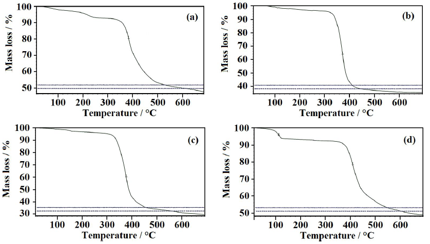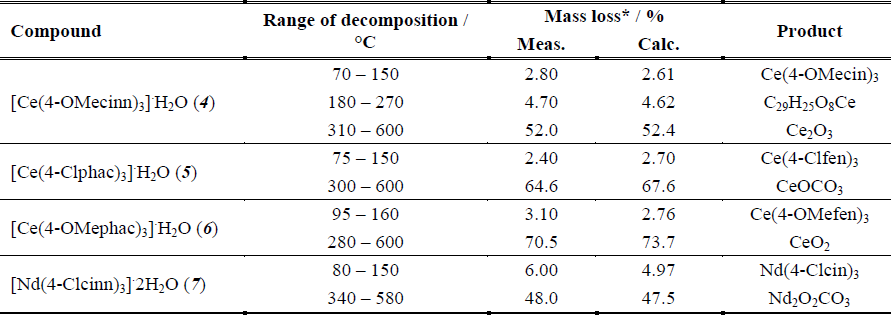 Thermal decomposition results of compounds 4‒7 in nitrogen are presented in Table 2 and Figure 3. For all compounds, the TG curves show endothermic decomposition between 70 °C and 160 °C, corresponding to the loss of hydration water molecules in one step. For the neodymium complex (7), the loss of two water molecules has been calculated; other compounds studied using TG are monohydrate. In the case of 4, the possible loss of the methoxy substituent on one of the ligands indicates the formation of C29H25O8Ce at 180-270 °C.