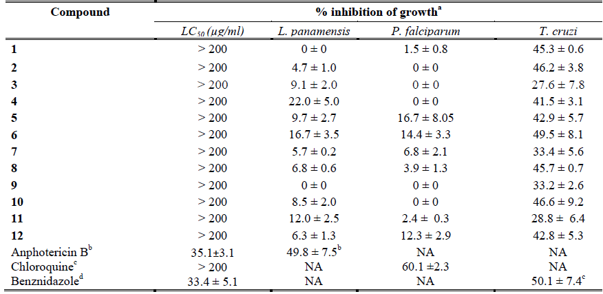 a Growth inhibition of U-937 cells or parasites determined by flow cytometry for intracellular amastigotes of L. panamensis, by fluorometry for all forms of P. falciparum and by the colorimetric β-galactosidase method for intracellular amastigotes of T. cruzi. Data are expressed as the average of at least two independent experiments, each performed in triplicate. b B amphotericin was applied at 0.05 μg/ml, the concentration at which infection is reduced by 50 %. c EC50 = 0.1 μg/ml d Benznidazole was applied at 10 μg/ml, the concentration at which infection is reduced by 50 %.
