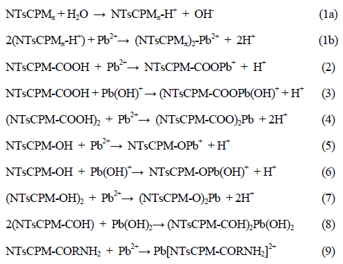 Los mecanismos de adsorción de los iones Pb2+en NTsC son muy complicados y se atribuyen a las fuerzas de atracción electrostática, fisisorción y quimisorción ya sea por intercambio iónico o por formación de complejos entre los iones de metales pesados y los grupos funcionales presentes en la superficie de los NTsC20. Por ejemplo, la adsorción de los iones Pb2+ en NTsCPM prístinos, NTsCPM-COOH, NTsCPM-OH y NTsCPM-CORNH2 puede ser descrita por las ecuaciones 1,2,3,4,5,6,7,8,923,52,58,59. En este caso las reacciones 1-7 ocurren por intercambio iónico, la reacción 8 por formación de puentes de hidrógeno y la reacción 9 por interacciones electrostáticas.