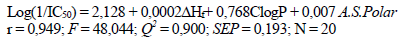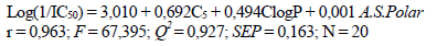 El parámetro IC50 y los diferentes descriptores moleculares de cada flavonoide estudiado, fueron utilizados para generar el modelo matemático-estadístico, mediante análisis de regresión simple y múltiple, empleando la respuesta biológica como IC50, ln(IC50) y – ln(IC50), evaluando la relación lineal a un nivel de probabilidad del 99 %. Para esto, se utilizó el programa Excel de Microsoft Office 2010. En el caso de correlaciones sencillas entre un descriptor y la actividad, se consideró la relación lineal cuando el coeficiente de regresión, r era mayor a 0,80. El análisis de regresión lineal múltiple se basó en el método de validación cruzada34, tomando en cuenta cuatro criterios: el coeficiente de correlación (r), el valor de Fisher (F), el error estándar de predicción y la habilidad predictiva. La ecuación para calcular la habilidad de predicción, tiene la siguiente forma: