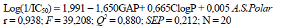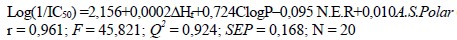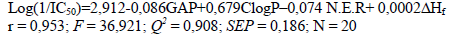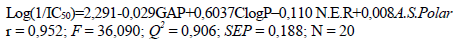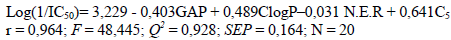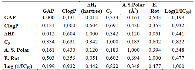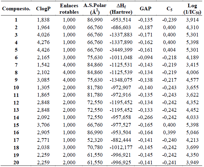 La tabla 2 muestra los descriptores más relevantes y sus valores numéricos, cuya combinación lineal describe la actividad biológica de los compuestos estudiados. Estos descriptores fueron obtenidos a través de regresión lineal múltiple por pasos (stepwise multiple regression, por su nombre en inglés), basado en el método estadístico forwardselection y backward-elimination. En este método, cada variable independiente (descriptores) es añadida o eliminada en cada paso de la regresión de acuerdo a tres criterios estadísticos: el valor de coeficiente de regresión, r, el valor del estadístico de Fischer, F y el valor de la desviación estándar de la regresión obtenida. De acuerdo a estos criterios, los mejores modelos estadísticos incluyen solo seis descriptores moleculares: ClogP, C5 (carga en el carbono C5), número de enlaces rotables, área de superficie polar, entalpía de formación (ΔHf) y diferencia de energía entre los orbitales fronteras (GAP). Los valores obtenidos para cada flavonoide, son mostrados en la tabla 2.