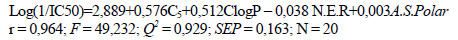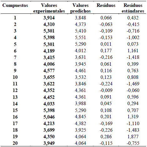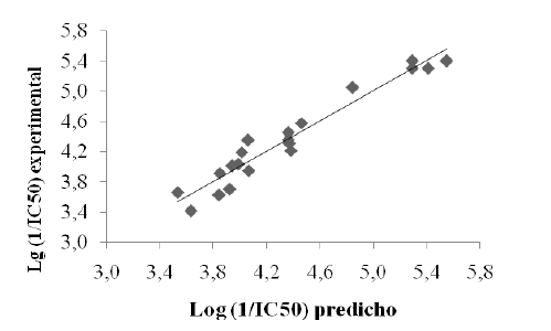 (21)De los doce modelos presentados arriba, la ecuación 17 es la que presenta mejor calidad estadística, dado que tiene un mejor ajuste a los datos experimentales (r = 0,970) y mejor valor de coeficiente de predicción (Q2 = 0,941); asimismo, presenta el menor valor del error estándar de predicción (SEP, por sus siglas en inglés).
