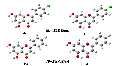 Estructuras optimizadas al nivel de teoría B3LYP/6-31G++(d,p) para los flavonoides más activos contra VIH1; a = Optimizado sin formación de enlace de hidrógeno; b = Optimizado con formación de enlace de hidrógeno.