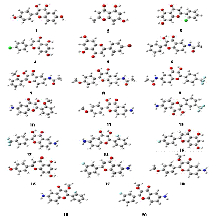 La selección de los flavonoides a estudiar fue basada en la búsqueda de la literatura de estructuras de flavonoides con actividad anti-HIV1, inhibidores de la enzima integrasa. Veinte estructuras de flavonoides (flavonas, flavonoles y aminoflavonoides) con sus correspondientes datos de IC50 fueron seleccionados de la literatura, tomando en cuenta los datos del parámetro IC50 y la estructura química25,26. Para preservar la homogeneidad de los datos a usar, se tuvo en cuenta que las pruebas biológicas que dieron origen al parámetro IC50 fueran realizadas usando el mismo método.