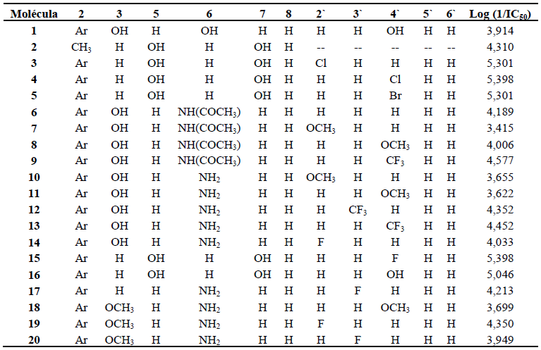 A partir de diferentes trabajos reportados, se escogieron 20 flavonoides cuyos valores de actividad tomaran en cuenta los criterios señalados25,26. Entre estas estructuras fueron seleccionadas flavonas y flavanoles, así como aminoflavonoides. La diferencia en la estructura, permite tener una idea de las características topológicas y electrónicas necesarias para que la molécula sea biológicamente activa. La variación en la estructura del esqueleto de los flavonoides estudiados se muestra en la tabla 1. Estas están basadas en el esqueleto básico de un flavonoide, el cual se muestra en la figura 1 para una flavona.