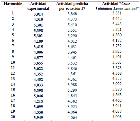 La validación de la ecuación 17 fue realizada usando el método “leave-one-out-cross validation”, los resultados obtenidos para cada flavonoide se muestra en la tabla 5. Usando éste método se encuentra un coeficiente de predicción, (Q2 C.V) de 0,91 con error estándar de estimación de 0,18. Como se observa, no existe diferencia significativa entre los valores arrojados por la ecuación 17 y el método de validación cruzada.