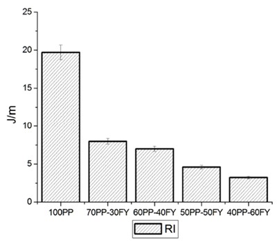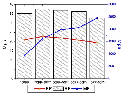 La tendencia general indica que ER y RF aumentan a medida que disminuye la carga de FY en la matriz polimérica. Sin embargo, los resultados obtenidos de la resistencia al impacto Izod (RI), indican un comportamiento inverso. Tal comportamiento es lo esperado tomando en cuenta los resultados del módulo de flexión (MF) mostrados en la figura 1 para toda la serie de compuestos analizados.