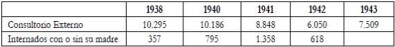 Los consultorios externos posibilitaron el establecimiento del examen médico como una práctica de rutina para los niños y niñas que supuso el triunfo de una visión, la médica, sobre la familia y la crianza36. En 1933 el servicio de niños, dirigido al control de la salud de los pequeños para que "puedan capear la más tormentosa época de su vida, que son los dos primeros años" atendió tres mil trescientos setenta y siete consultas, el consultorio ginecológico realizó ciento ochenta y ocho consultas mientras que el servicio odontológico practicó cuatrocientas cincuenta y nueve consultas de mujeres y niños37.