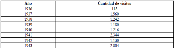 El Cuadro N° 6 nos permite observar el gran número de visitas efectuadas, en tanto constituían el núcleo de su labor. El objetivo de dicha actividad era múltiple, incluía tanto recordar el calendario de vacunación, llevar la medicación en enfermedades como la tuberculosis y las venéreas, realizar el control de los embarazos y de los partos, observar la alimentación de bebés y niños pequeños -con vigilancia del peso, altura y otras variables de crecimiento normal- además de examen del orden y limpieza de las personas y viviendas. Ejercían, además, tareas de inspección; vigilaban que los partos fueran realizados por parteras autorizadas y estaban obligadas a denunciar la atención ilegal de los nacimientos. En muchos de los casos, sus acciones buscaban transformar situaciones sociales desesperadas, se ocupaban de legalizar los matrimonios, sobre todo ante la presencia de hijos en la pareja, y de conseguir víveres76.