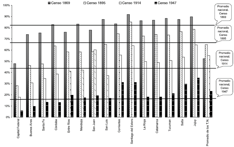 A partir de los datos compilados en los censos nacionales, podemos advertir que en materia educativa Mendoza se ubicó próxima al promedio nacional desde 1869 a 1947. La provincia tenía 83,3 % de analfabetos en el total de su población en 1869, valores que se redujeron rápidamente a 58 % para 1895 y 42 % en 1909. Este nivel se mantuvo relativamente estable entre 1909 y 1914 y volvió a descender hasta mediados del siglo XX, cuando el analfabetismo alcanzó 17,3 %, según el Cuarto Censo Nacional de 194719. (Gráfico 1)