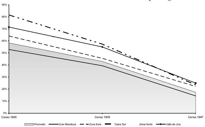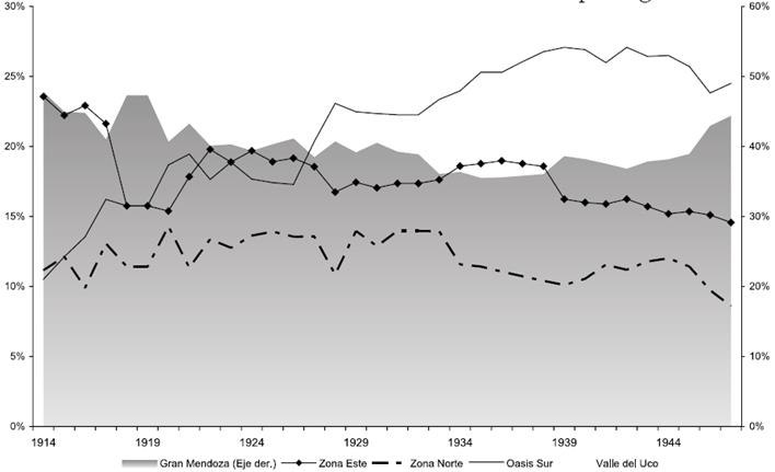 Esto permite pensar en una cuasi unificación del espacio rural a las ciudades y su consecuente menor urbanización en términos relativos a nivel nacional. Como lo muestran los censos, la población que vivía en el sector rural representaba el 48 % del total de Argentina en 1914, mientras que en Mendoza representaba el 68 %. Para 1947 la diferencia se había reducido pero la provincia se mantenía por arriba de la media nacional: 38% del total de la población del país vivía en áreas rurales, mientras que en Mendoza llegaba al 50 %. Por otro lado, esto implicó una mayor integración entre las actividades del ámbito rural con las urbanas que se vio reflejado en un mercado de trabajo marcado por la pluriactividad desde períodos muy tempranos8.