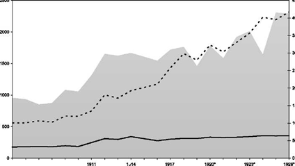Entonces, esta dificultad debió ser compensada a través de un incremento de maestros, lo que permitió bajar la proporción de alumnos por docente. Si bien no es posible conocer la distribución de los docentes, el incremento debió ser un factor que influyó positivamente sobre el descenso del analfabetismo en la región y que debió incidir favorablemente en la calidad educativa26. Según los datos brindados por Leopoldo Suárez, el mayor descenso se dio en el período 1911-1919, cuando la relación pasó de 47 a 21 alumnos por docente, relación que se mantuvo hasta el final del período para el cual tenemos datos27.