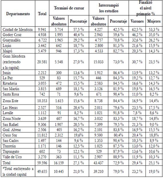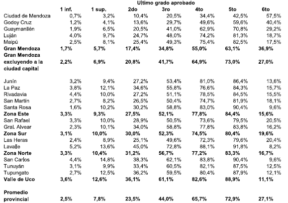 En primer lugar, se puede verificar que solo el 27,1 % de los jóvenes relevados por el censo había terminado el ciclo básico obligatorio. Este cuadro muestra, asimismo, las diferencias intrarregionales, donde se repiten, por un lado, los contrastes entre la ciudad capital y el Gran Mendoza, departamento que duplica al promedio provincial. Por otro lado, las diferencias son sustanciales entre la capital y el resto de los departamentos aun dentro la misma región, característica que se mantiene de los censos anteriores.
