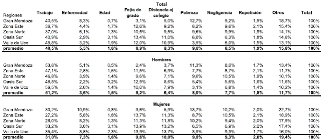 Si se analizan los datos para cada una de las regiones se observa una marcada homogeneidad con relación a la principal causa de abandono que era el trabajo de los menores. Sin embargo, se observan diferencias sustanciales entre las regiones con la segunda causa de deserción. Mientras que la pobreza tenía una mayor incidencia en el Gran Mendoza, la falta de grados o la distancia a los establecimientos educativos eran más importantes en el 152 Oasis Sur, Valle de Uco y en la región Norte. Por último, llama la atención ' la variable "otros" -que surge como suma de componentes-, ya que tiene un peso significativo, especialmente en el caso de las mujeres.