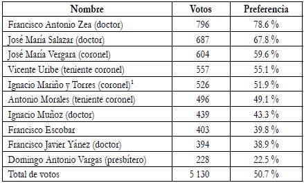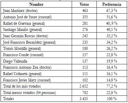 Las preferencias electorales reflejaron un número importante de candidatos al contabilizar 96 personas que obtuvieron al menos un voto, aunque 12 de los seleccionados más votados reunían el 33 % de los votos totales (3.435) y los 85 restantes representaban apenas el 23 % (382). Si bien no existieron candidaturas formales, la ciudadanía de la Provincia de Cumaná seleccionó a destacados personajes políticos y militares oriundos en su mayoría del oriente venezolano, evidencia de un claro reflejo de la cultura política que se experimentó en este contexto electoral. Con respecto a la relación del voto civil y militar, vale la pena destacar que de las 96 candidaturas que al menos consiguieron un voto, 65 de ellos (65,59 %) eran militares y apenas 31 civiles (34,41 %). En el Cuadro 1 muestro información detallada de los resultados electorales de los 12 candidatos más votados en la Provincia de Cumaná y de los 84 aspirantes restantes39.