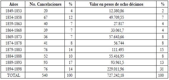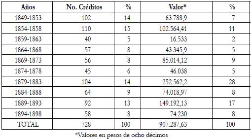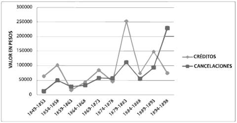 Después de varios períodos de crecimiento y descrecimiento en el comportamiento del crédito, vino uno de auge en 1879-1883. Como se observa en el Gráfico 1, fue el pico más alto que tuvo el ritmo del crédito durante la segunda mitad del siglo XIX. Durante este tiempo los capitales invertidos en este sector de la economía pasaron de $ 46.038 pesos de ocho décimos a $252.562,2; asimismo, hubo incremento significativo en los recaudos de las cancelaciones que pasaron de $56.744 pesos de ocho décimos a $111.495.