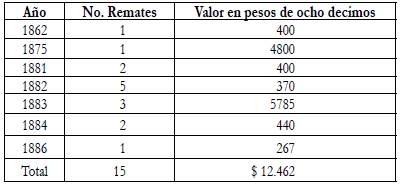 Además, los plazos fijados para sus pagos eran demasiado cortos e improrrogables. En este sentido, la obligación era más laxa para los intereses personales de los prestatarios porque les permitía obtener préstamos bajo las mismas condiciones que los registrados en una retroventa con o sin el gravamen de un bien inmueble; también se podía respaldar con otros patrimonios. Incluso, para los deudores no era tan agobiante el pago de una obligación registrada en una escritura notarial cuando se vencían los términos para cancelarla, el buen comportamiento en los pagos de los réditos pactados con los acreedores les aseguraba prácticamente tener nuevas prórrogas sin ver amenazadas sus propiedades. De hecho, durante el período estudiado fueron pocos los prestamistas que recurrieron a los estrados judiciales para iniciar procesos de remates sobre las propiedades que estaban gravadas con créditos vencidos como se observa en la Tabla. 2. Inferimos que el bajo número de remates que hubo en el mercado se debió al buen comportamiento en los pagos de las deudas por parte de los prestatarios y a los nuevos acuerdos que llegaban de manera informal con sus acreedores.