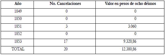 De esta forma, cuando en 1853 se reiniciaron los pagos de las cancelaciones crediticias (ver Tabla 5), los plazos de algunas acreencias adquiridas en meses y años anteriores estaban vencidos. Ello infló sus valores que recayeron sobre los prestatarios, quienes tuvieron que pagar intereses sobre intereses hasta poderlas cancelar totalmente. Un ejemplo fue el préstamo que benefició mancomunadamente en 1852 a los señores Ignacio y Juan Salcedo por valor de $660 pesos de ocho décimos, pactado para ser pagado en un plazo de un año y con un interés del 2,5 % mensual17. Pero no fue cancelado en 12 meses, sino en 24, por lo tanto, los deudores pagaron la suma de $1.056 pesos de esta forma: $660 por el capital prestado y $396 por el concepto de intereses corrientes.