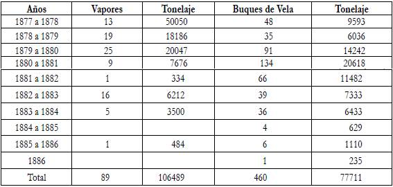 Después del auge, las operaciones crediticias que se contrajeron en 18841888, cayeron severamente en comparación al período anterior. El desplome fue el resultado de diversos factores socioeconómicos que afectaron las dinámicas del comercio local y nacional. Uno de ellos fue el estancamiento en el sector exportador como resultado de la crisis quinera y la caída de los precios internacionales del café36 que propiciaron el declive del flujo de mercancías y pasajeros movilizados por el puerto de Barranquilla como se observa en la Tabla 6. Sumado a lo anterior, la guerra civil de 1885, entre liberales y conservadores, profundizó aún más la crisis de este puerto porque fue tomado por el ejército rebelde del general Gaitán Obeso como estrategia militar para bloquear el transporte de tropas y suministros de armas y de alimentos por el río Magdalena37. Por consiguiente, el flujo de toneladas y el ingreso de vapores por esta rada decayeron severamente (ver Tabla 6).