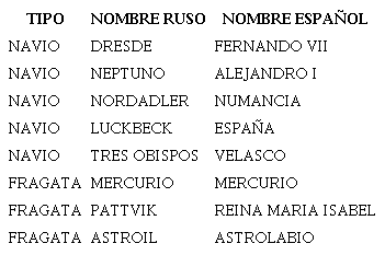 "Componíase la escuadra, comprada a buen precio al emperador Alejandro, de 5 navios de línea de 74 cañones y 3 fragatas de 44, pero resultó que apenas entregados los barcos en Cádiz sólo podían servir un navío y una fragata, por hallarse podridas las maderas de los demás"10.