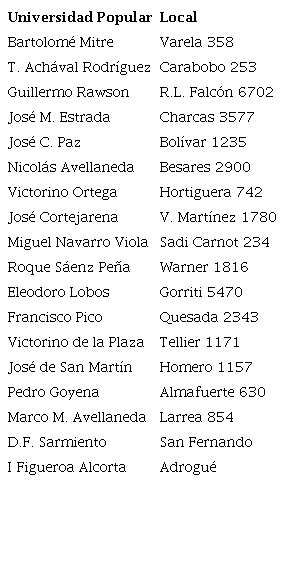En esta relación podemos contar 18 Universidades Populares que funcionaron en la ciudad de Buenos Aires y pueblos suburbanos, de las cuales ninguna tiene el nombre del barrio en el cual se emplazaron. De las 22 Universidades Populares que funcionaron en el interior del país el panorama es un poco más diverso. 17 hacen referencia al sitio donde están radicadas, pero esta consideración nos puede llevar a un error ya que pudimos saber, por ejemplo, que la Universidad Popular de Baradero se llamaba Mariano Moreno76.
