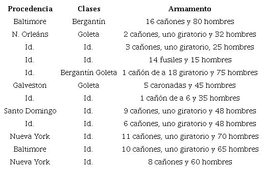 En todo este tiempo La Corona española tenía bien identificados a los navegantes insurrectos. A mediados de 1817 las autoridades habaneras dieron una relación de los corsarios que estaban cruzando contra las naves españolas para ese año, con información sobre su procedencia, el tipo de embarcación y el armamento que traía consigo. Contabilizaron para entonces doce buques, aunque aseguraban que otros seis más se estaban armando en Nueva Orleáns.