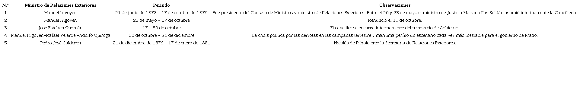 Las legaciones fueron el espacio donde se desempañaban los ministros plenipotenciarios, ministros residentes y encargados de negocios4. Al estallar la guerra, las legaciones se priorizó la identificación de los objetivos que debían conseguirse en América y Europa, además de sabotear el trabajo de los diplomáticos chilenos. Para 1879 el Perú tenía legaciones operativas en Francia, Inglaterra, Estados Unidos, Argentina, Bolivia y se reforzó con la apertura de otras en Brasil, Centroamérica y Colombia, para lo cual se apeló al patriotismo del personal diplomático porque muchos aceptaron asumir puestos con un sueldo menor o de forma ad honorem por la grave crisis económica5. Con la guerra encima, todas las legaciones tuvieron que alinearse rápidamente a este nuevo escenario y debían evadir los obstáculos y espionaje que interpondrían los diplomáticos chilenos. Sin embargo, uno de los principales obstáculos fue la inestabilidad en el cargo de ministro de Relaciones Exteriores por los cambios continuos del gabinete ministerial y por los efectos de la evolución de la guerra, desfavorable para el Perú en Tarapacá, tal como se aprecia en la siguiente tabla: tuvimos más de 5 funcionarios en la conducción de la Cancillería en 1879, incluyendo los gobiernos de Mariano Ignacio Prado y la instauración de la dictadura de Nicolás de Piérola: