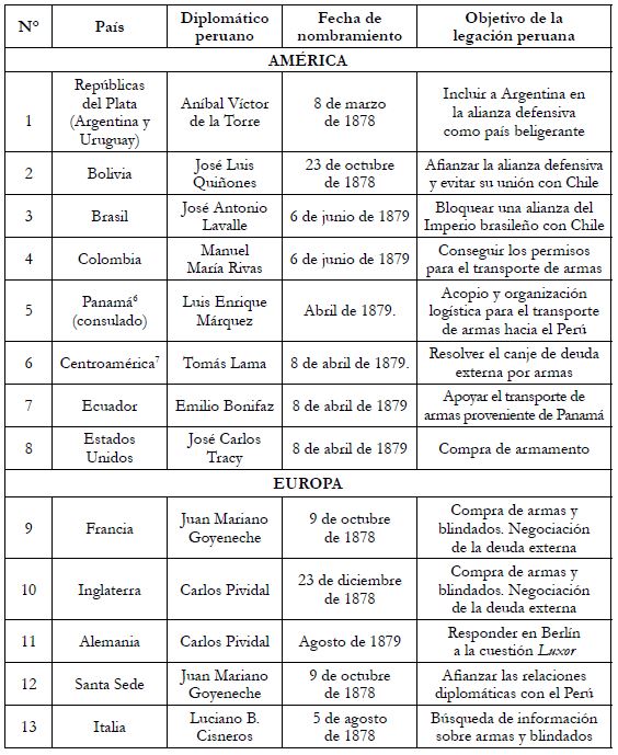 Ahora, veamos la tabla con los principales objetivos trazados por la Cancillería peruana por cada legación en América y Europa durante 1879, el año de inicio de la guerra del Pacífico, y basada en la revisión de los documentos del Archivo del Ministerio de Relaciones Exteriores. En América prevaleció la consecución de alianzas y transporte de armamento desde Panamá hasta el Callao, mientras que en Europa se hizo todo lo posible para romper el bloqueo de los bondholders (tenedores de bonos) y la compra de elementos bélicos (desde municiones hasta blindados).