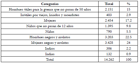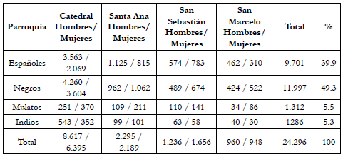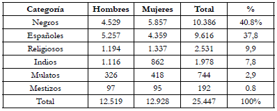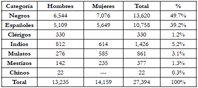 Lo que se desprende de este censo es que la población afrodescendiente era mayoritaria respecto a otros grupos. Solo entre negros y mulatos bordeaban el 45% del total de la población. Otro punto para destacar es la presencia mayoritaria de mujeres negras y mulatas al igual que mujeres religiosas. La diferencia entre hombres y mujeres afrodescendientes superaba las mil mujeres. Sin temor a equivocarnos, este grupo de mujeres bien pudo vincularse con los españoles que en comparación con las mujeres españolas, eran mucho más. Esto explicaría el crecimiento de la población mulata. Sin embargo, en este período los mulatos preferían no autoidentificarse para escapar del pago de tributos.
