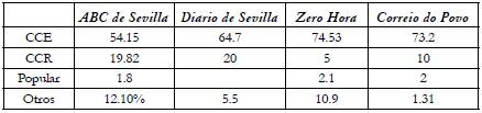 La estrecha relación entre CCE, CCR y el circuito empresarial se entiende desde un punto de vista estructural de la propiedad. Las dos cabeceras porto alegrenses ofrecen una mayor representación de la cultura local que las de Sevilla, aunque no profundicen tanto y tengan un carácter más informativo. Hemos de pensar que, tanto Zero Hora como Correio do Povo, pertenecen a dos de los grandes conglomerados mediáticos brasileños: O Globo y Record, respectivamente. Estos dos gigantes de la comunicación poseen muchos intereses en la cultura local, entre otros, porque forman parte de la industria cultural local. Zero Hora forma parte un grupo con la televisión más importante a nivel regional, RBS TV, emisoras de radios y diarios locales por todo el estado de Rio Grande do Sul, productoras de contenidos y de eventos. Entonces, es habitual encontrar en las páginas de Zero Hora publicidad de eventos locales patrocinados por el grupo RBS.