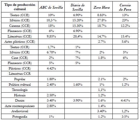 A la hora de hacer un estudio comparado del tratamiento de la cultura en la prensa local de los cuatro periódicos de Sevilla y de Porto Alegre, vemos que, aunque hay cinco opciones para agrupar los temas culturales del CCE y del CCR, la información se reduce a prácticamente tres: cine, música y literatura, que son sectores estratégicos del crecimiento y concentración económica de las industrias culturales. Si analizamos de modo comparado, las temáticas abordadas no difieren en forma, a pesar de que se han estudiado periódicos de diferentes países con estilos de vida y cultura diferenciadas. Asimismo, se observa que tienen predominancia la música, el cine, los libros y el teatro. La principal diferencia es la representatividad de las artes plásticas, que gana más espacio en la prensa porto alégrense. Las demás temáticas siguen líneas similares.