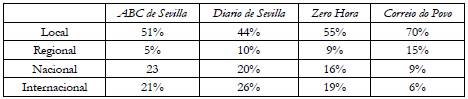 Se ha comprobado que el espacio que dedican los medios porto alegrense a la sección de cultura es mayor que el dedicado en los periódicos de Sevilla. Concretamente, los de Porto Alegre suman 1948 textos periodísticos, frente a los 1781 de Sevilla. Esta diferencia se acentúa si nos centramos en el ámbito local, ya que los periódicos de Porto Alegre dedican un espacio mayor a las publicaciones sobre la cultura en la ciudad, con un total de 1232 publicaciones, mientras en los diarios sevillanos encontramos 822 publicaciones.