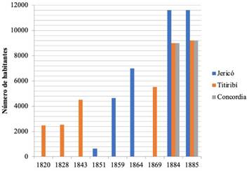 La Figura 2 muestra cómo la migración poblacional en las tres localidades fue bastante significativa, ya que entre 1820 y 1885 la curva siempre estuvo en ascenso. Al situarlo en un contexto y en la perspectiva procesal histórica se observa que la expansión de la frontera agrícola estuvo acompañada del asentamiento humano, tanto espontáneo como dirigido por empresarios. El fenómeno se vio impulsado por los flujos migratorios generados por las políticas de distribución de tierras baldías, así como por la explotación agrícola, ganadera y minera. Estas actividades económicas ofrecieron incentivos laborales, comerciales, migratorios y de acumulación de capitales; además, conllevó al gradual mejoramiento de la red de caminos, afectada por los efectos del clima y las condiciones geográficas. Cabe anotar, que la región antioqueña no era la más poblada respecto a otros Estados como Santander, Boyacá, Cundinamarca y Cauca. Así, Titiribí pasó de 2480 pobladores en 1820 a 9214 al finalizar ese período, Concordia de 9000 en 1884 a 9208 al año siguiente, y Jericó de 630 en 1851 a 11593 en 1885. Esos datos no logran dar cuenta de la cantidad real de habitantes, pero sirven de indicador para evidenciar el incremento migratorio de los tres asentamientos durante el período mencionado. Además, los valores pueden variar si consideramos que Concordia y Jericó hicieron parte del distrito Parroquial de Titiribí hasta sus respectivas fundaciones. De hecho, el aumento de habitantes también era una razón importante para que cada localidad alcanzara su independencia administrativa. Lo cierto del asunto es que el aumento poblacional incidió en los tres asentamientos y estableció las condiciones para que Titiribí, Concordia y Jericó se afianzaran como frentes de colonización y centros de avanzada migratoria.