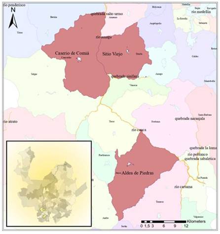 Precisamente, en 1869, Ciudad Bolívar fue erigido municipio abarcando los corregimientos de Betania, Andes y Jardín; eso hizo que Concordia perdiera su figura político-administrativa y volviera a depender de Titiribí.28 En ese sentido, los conflictos por las tierras y la autoridad de los lugares que configuraban a Concordia y Titiribí ocuparon un papel importante en la conformación espacial y político-administrativa de las localidades lejanas a la banda occidental del río Cuaca en el Suroeste antioqueño, pues incidieron en el desplazamiento hacia las aldeas y caseríos más apartados, e influyeron en el asentamiento y ordenamiento territorial de los poblados que se conformaron durante todo el siglo XIX (Figura 3).