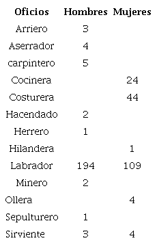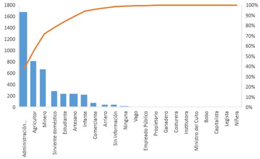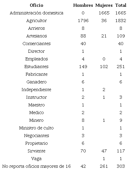 Pasadas dos décadas y frente al ascenso de la población, los agricultores eran la población mayoritaria; aspecto que también era equiparado con el núcleo dedicado a la "administración doméstica", en cuyo oficio las mujeres jugaban un papel determinante seguido de estudiantes, sirvientes y artesanos; como lo muestra la Tabla 2.
