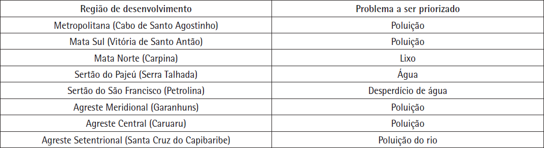A análise dos dados (Quadro 1) nos permite considerar que os municípios localizados na região Sertão (Petrolina e Serra Talhada) elegeram os problemas relacionados à água como prioritários, pois no Sertão do Pajeú, a seca produz dificuldades, como a escassez desse recurso e no Sertão do São Francisco os impactos sobre o rio São Francisco (assoreamento, desperdício de água, problemas da transposição e do projeto de fruticultura irrigada) estariam na ordem do dia das preocupações não apenas dos jovens, mas também da população ali localizada. Já no Agreste Setentrional, o destaque para a poluição do rio se deve à própria dinâmica de desenvolvimento dessa região, centrada no Polo de Confecções do Agreste, em que o processo de lavagem do jeans está baseado no alto consumo de água e na geração de efluentes altamente contaminados com produtos químicos. Nas demais regiões, a poluição aparece como um aspecto geral dos impactos próprios das atividades produtivas nessas regiões de desenvolvimento.
