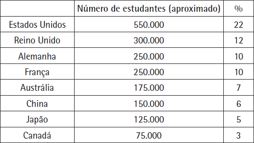 Institute for International Education. Atlas of Student Mobility (in Contel e Lima, 2007, p. 182).Estes oito países, juntos, polarizam nada menos que 75% do número de estudantes estrangeiros de todo o mundo, sendo que os quatro primeiros – Estados Unidos e principais países da Europa Ocidental – acumulam mais de 50% dos estudantes estrangeiros de todo o globo. Tal dado nos permite lembrar a correlação pontuada acima entre os principais mercados internacionais e a influência do poder econômico na geopolítica do conhecimento. Além de pontuar quais são os principais países receptores de estudantes estrangeiros, é importante destacar quais são os principais países que exportam estudantes para o “centro global”. A Tabela 2 nos permite visualizar este aspecto.