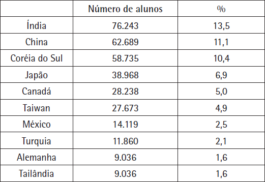 Institute for International Education. Atlas of Student Mobility (in Contel e Lima, 2007, p. 183).Vale destacar, a partir da Tabela 2, que retirando o Canadá – que, por questões territoriais, envia grande quantidade de estudantes para o país limítrofe – Alemanha e Japão, todos os outros são países que não ocupam posição central no “sistema-mundo”. A partir desta tabela pode-se destacar também que a internacionalização do ensino superior tem relação direta com projetos de desenvolvimento dos países. Os três países que mais enviam estudantes para os Estados Unidos – Índia, China e Coreia do Sul – são países que adotaram como políticas de Estado seu crescimento econômico e tecnológico com ênfase no investimento em educação – a Coreia do Sul, pelo investimento pesado, na segunda metade do século XX, nas “ciências duras” e engenharias, e a China e a Índia, pelo papel protagonista que estão assumindo recentemente na economia mundial (os estudantes dos três países correspondem a mais de 30% dos estudantes estrangeiros nos Estados Unidos).
