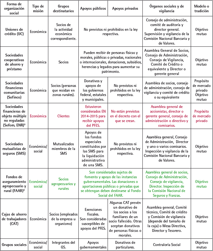 Fuente: Elaboración propia con la validación de los siguientes expertos en los diferentes tipos de organizaciones: Diana Elisa Bustos Contreras y Alfredo Tapia Naranjo del Campo Experimental Bajío, Instituto Nacional de Investigaciones Forestales, Agrícolas y Pecuarias (Inifap) para las organizaciones agrícolas; José Antonio Espinosa García del Centro Nacional de Investigación en Fisiología y Mejoramiento Animal, Inifap, sobre las pecuarias; Jesús Zárate Mancha, consultor independiente, acerca de las forestales; Mario Rechy Montiel, ex Asesor de la Comisión de Fomento Económico en el Senado de la República, para las cooperativas y organizaciones de trabajadores y Alejandro Natal Martínez, Investigador del Departamento de Procesos Sociales de la Universidad Autónoma Metropolitana Lerma, sobre las organizaciones de la sociedad civil y los grupos sociales. No obstante su especialidad, varios de ellos opinaron sobre todas las figuras jurídicas.Siglas: ARIC: asociaciones rurales de interés colectivo; SPR: sociedades de producción rural; SSS: sociedades de solidaridad social; SCAP: sociedades cooperativas de ahorro y préstamo; OC: organismos cooperativos; SM: sociedades mercantiles (con participación de OSSE de al menos 51% de su capital social); UC: uniones de crédito; Sofinco: sociedades financieras comunitarias; SMS: Sociedades mutualistas de seguros; FAAR: fondos de aseguramiento agropecuario y rural; CAT: cajas de ahorro de trabajadores; GS: grupos sociales; OSC: organizaciones de la sociedad civil; AC: asociaciones civiles; SC: sociedades civiles; IAP: instituciones de asistencia privada; IBP: instituciones de beneficencia privada.Notas: Las valores corresponden a los siguientes atributos: 0: El indicador no está presente en ese tipo de organización; 1: Algunas organizaciones poseen esa característica; 2: Muchas organizaciones cumplen con ese criterio y 3: Es un rasgo distintivo de ese tipo de organizaciones.1 Incluyen dos o más organizaciones del mismo tipo.2 Son parte del SSE las que cuenten con participación de organismos del SSE de al menos 51% del capital social.3 Uniones (de cooperativas de distintas ramas de actividad económica), federaciones (de cooperativas de la misma rama de actividad económica) y confederaciones (varias uniones o federaciones de por lo menos diez entidades federativas o, si son de SCAP, todas las federaciones) de productores de bienes o servicios, de consumidores de bienes o servicios, o de ahorro y préstamo.4 El 29 de marzo de 2016 se publicó una modificación al COSSE que elimina a las sociedades financieras de objeto múltiple no reguladas y añade a los Fondos de Aseguramiento Agropecuario y Rural.5 Para las organizaciones que se ubican en el sector terciario consideramos prestación de servicios continua.En la actualidad no existe una política pública de fomento a la economía social en México; a pesar de que se aprobó el PFES 2015-2018, el cambio de adscripción del INAES a la Sedesol a partir de 2016 significó añadirle más obligaciones “sociales” (y menos económicas), ya que debe coadyuvar al cumplimiento del Sistema Nacional para la Cruzada contra el Hambre, el Programa Nacional de Desarrollo Social 2014-2018, el Programa de Desarrollo Innovador 2013-2018, el Programa Nacional para la Prevención Social de la Violencia y la Delincuencia 2014- 2018, el Programa Nacional de Derechos Humanos 2014-2018 y el PND 2013-2018.