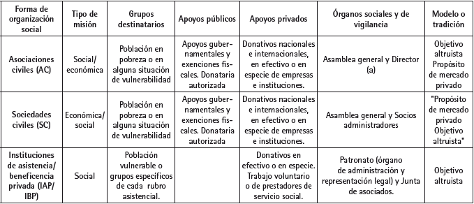 Asociaciones civiles (AC). Se conforman por un conjunto de personas con el objetivo de realizar actividades en las que no prime el sentido económico. A pesar de que no persiguen lucrar, tampoco pretenden estar en número rojos (“sin ánimo de lucro, pero sin afán de pérdida”) por lo que lo relevante es cómo se distribuyen los beneficios. No obstante, la mayoría de estas sobreviven gracias a los donativos de organismos internacionales y los subsidios y apoyos gubernamentales. El repliegue del Estado creó las condiciones para que estas organizaciones proliferaran sobre todo en la atención de grupos vulnerables y de los temas que no eran de interés de la empresa privada ni del sector público.