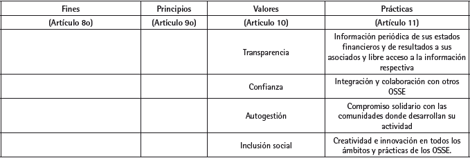 En lo doctrinal se produce un retroceso significativo al establecer como meramente declarativa la adscripción a los fines, valores, principios, y prácticas de la economía social y solidaria (Artículo 7). Además, no se hace el arreglo correspondiente e indispensable a los artículos 8, 9 y 10, pues persiste la confusión entre valores, principios, fines y prácticas, etc. (REDCOOP, 2013, numeral 5).