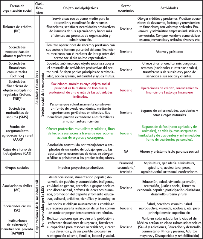Fuente: Elaboración propia con base en la legislación vigente aplicable a cada figura jurídica y el Catálogo 2016 de organismos del sector social de la economía (29/03/2016).Nota: El Catálogo de organismos del sector social de la economía incluye, además, a las uniones de ejidos o de comunidades o de sociedades de producción rural. Para ser susceptibles de los apoyos del PFES deben estar integradas por dos o más ejidatarios o comuneros (al igual que las asociaciones rurales de interés colectivo). Aunque tienen un sentido estratégico aún no visible ni utilizado LESS: Ley de la Economía Social y Solidaria.1 Uniones, federaciones y confederaciones de sociedades cooperativas de productores de bienes o servicios; de consumidores de bienes o servicios, y de ahorro y préstamo2 Son parte del SSE las que cuenten con participación de organismos del SSE (OSSE) de al menos 51% del capital social.3 El 29 de marzo de 2016 se publicó una modificación al COSSE que elimina a las sociedades financieras de objeto múltiple no reguladas y añade a los fondos de aseguramiento agropecuario y rural.Notas