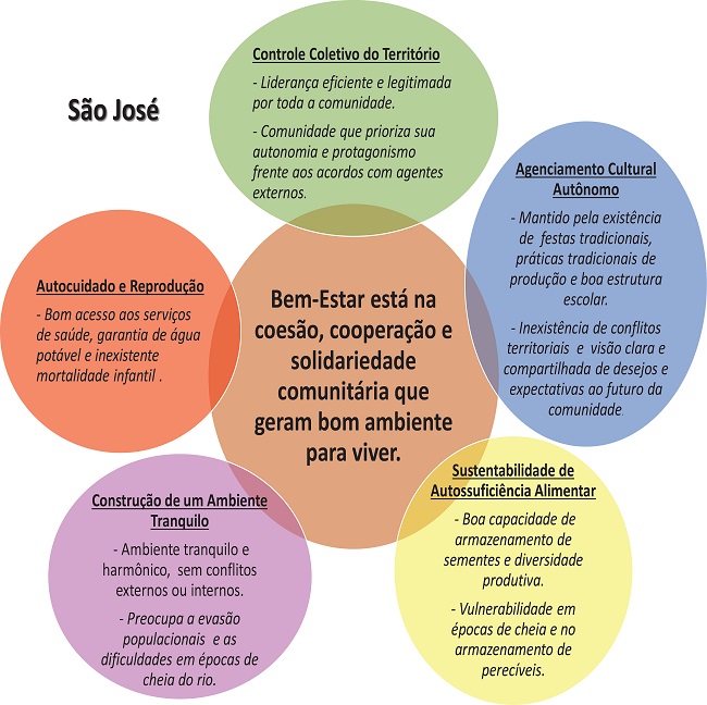 Por sua vez, o Bem-Estar em São José parece estar assegurado pela construção de uma identidade coletiva e cultural coesa, com boa dinâmica de liderança; na compreensão da população a respeito dos ciclos do rio e do plantio, no armazenamento dos insumos; no acesso garantido ao pré-natal e na equidade entre a medicina formal e tradicional. São José historicamente construiu de maneira autônoma boa capacidade coletiva sobre o território; constante capacidade de agenciamento cultural; capacidade de construir ambiente tranquilo através de adequado contrato social e capacidade relativamente estável em suprir as demandas produtivas garantindo a autonomia alimentar.
