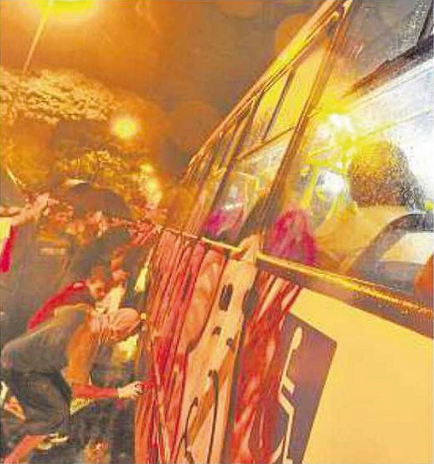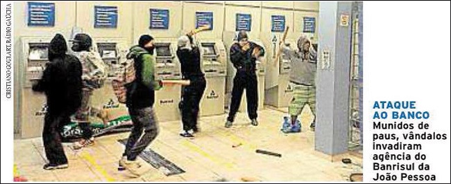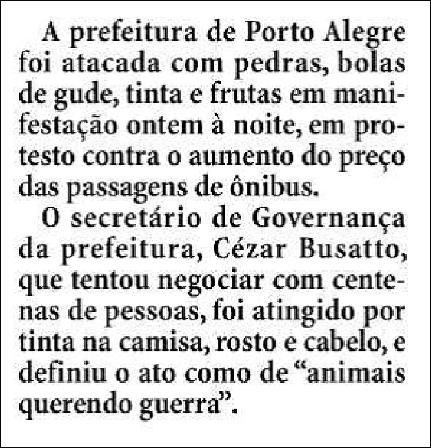 Quanto ao evento de protesto de 04 de abril, a notícia “Protesto e comemoração sob aguaceiro” narra algumas situações conflitivas. Como ações vinculadas a essas situações, o jornal descreve a realização de pichações a muros, a viadutos e a “pelo menos 10 ônibus”, por “mascarados, identificados com movimentos anarquistas”. Além disso, a notícia descreve um “ataque à sede da Empresa Pública de Transporte e Circulação (EPTC)” como “o momento mais tenso” do evento, quando “o grupo de mascarados [...] quebrou vidros do prédio da EPTC com taquaras, pedras e bolas de gude”. Esses atos são classificados como “vandalismo” e representados pela Figura 4.