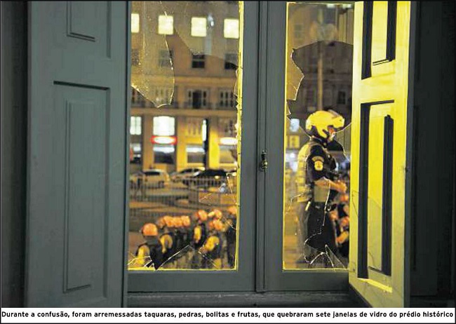 Conforme Tilly (2006), as performances compõem o repertório da ação coletiva, e é por meio delas que inovações são possíveis. No ciclo de protestos de 2013, as performances compostas por ações violentas representaram novidades aos padrões de ação coletiva em relação aos anos anteriores (Tabela 2). No entanto, a interpretação da violência configura um campo de disputa, sendo o próprio sentido de “violência” polissêmico (Michaud, 1989). O processo de enquadramento, ao selecionar determinados elementos da vida social e produzir um “quadro” que simplifica a complexidade do mundo (Benford e Snow, 1992), vincula a característica da violência (e confere valor) a determinado fenômeno. Por exemplo, a quebra de vidraças da prefeitura por manifestantes durante um protesto pode ser vinculada tanto a uma forma de manifestação pública de demanda coletiva quanto a uma “baderna” (Figura 3).